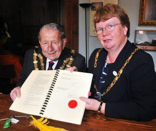 District council chairman Jane Moreton presented the contract to Bridgwater mayor Ken Richards and made a financial pledge